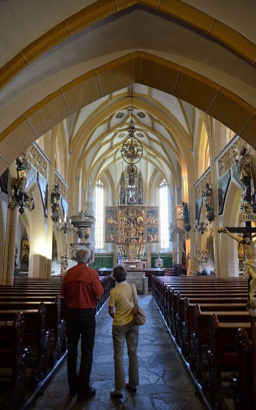 In der Mitte der Kirche führen einige Stufen in ein Gruftgewölbe hinab, wo das sargähnliche Grabmal des frommen Mannes gezeigt wird, dessen wundersamem Geschenk das Dorf Heiligenblut seinen Namen verdankt.